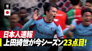 エールディヴィジ2025-26シーズン第30節、NECナイメヘン対フェイエノールトの直接対決。アウェイのフェイエノールトがFW上田綺世のヘディングゴールで先制。上田は今季23ゴール目を記録した。
